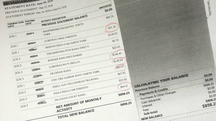 The statement also showed a purchase to Credit Risk Management Canada in Stratford, Ont. for $3,053.88 in October. According to their website, the company provides debt recovery solution and credit investigations, along with other services like financial care contact management.