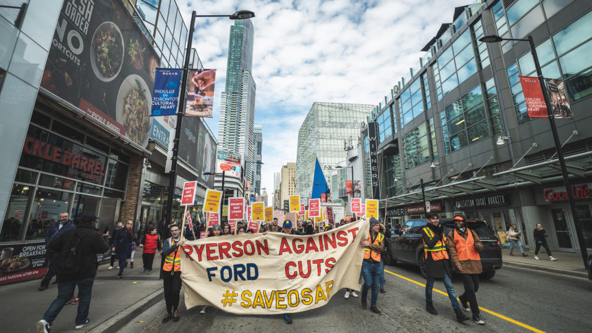 On Nov. 6, Ryerson students gathered for a one-day student strike across Toronto. The day of action began with a soft picket line in front of the Sheldon & Tracy Levy Student Learning Centre, followed by a rally outside of the Student Campus Centre. Then, the strike culminated in a march that spread to the intersection of Yonge and Dundas streets, OCAD University and finally Queen’s Park. Support was shown from students, faculty and even Ontario representatives who were present at the day of action.