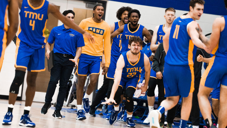 The TMU men's basketball team in blue jerseys celebrate after a big bucket