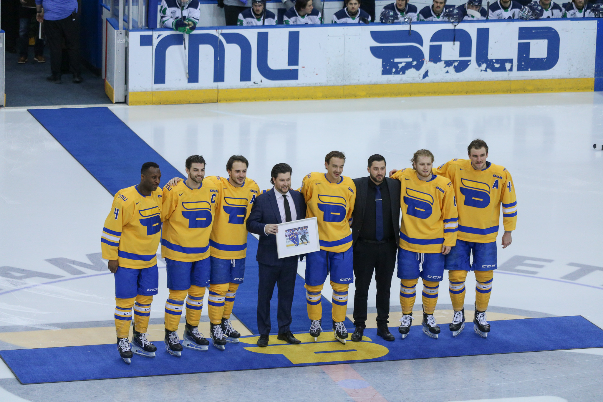 Fourth-year forwards Jackson Doherty, Chris Playfair, Will Sirman, Kevin Gursoy and Aleks Dimovski, as well as fifth-year defender Matthew Barnes and fourth-year defender Joe Rupoli were honoured before puck drop.