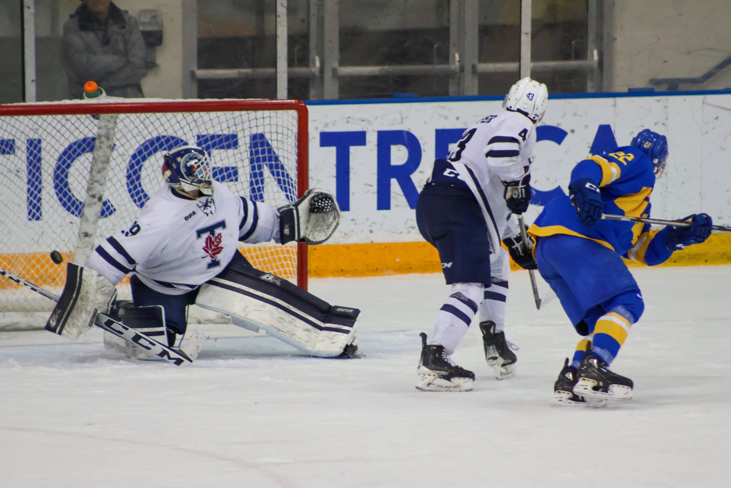 The penalty problems escalated for U of T, as a high-sticking call granted TMU another chance to even up the game. Third-year Blues goaltender Rayce Ramsay stepped up to the challenge by saving multiple dangerous shot attempts.