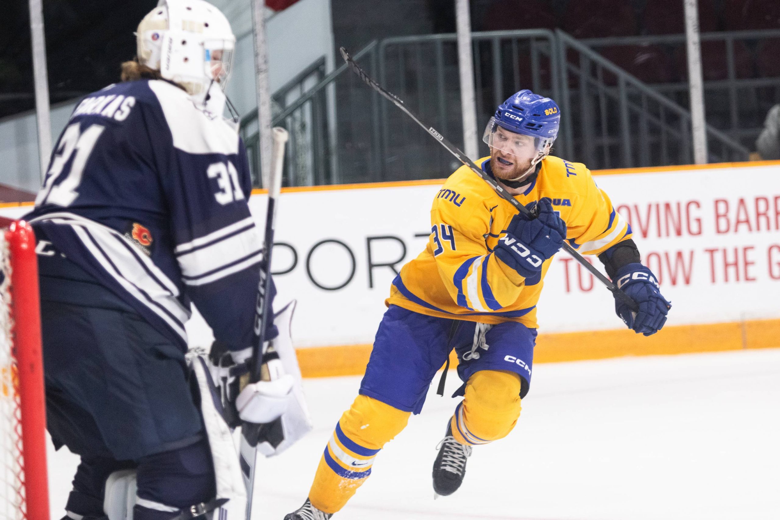 The third period opened in similar fashion to the second, as Patton struck again just over a minute in, restoring Mount Royal’s two-goal cushion. The Cougars ramped up their speed, while TMU played with desperation, peppering third-year goaltender Shane Farkas with shots but failing to break through—until they did.