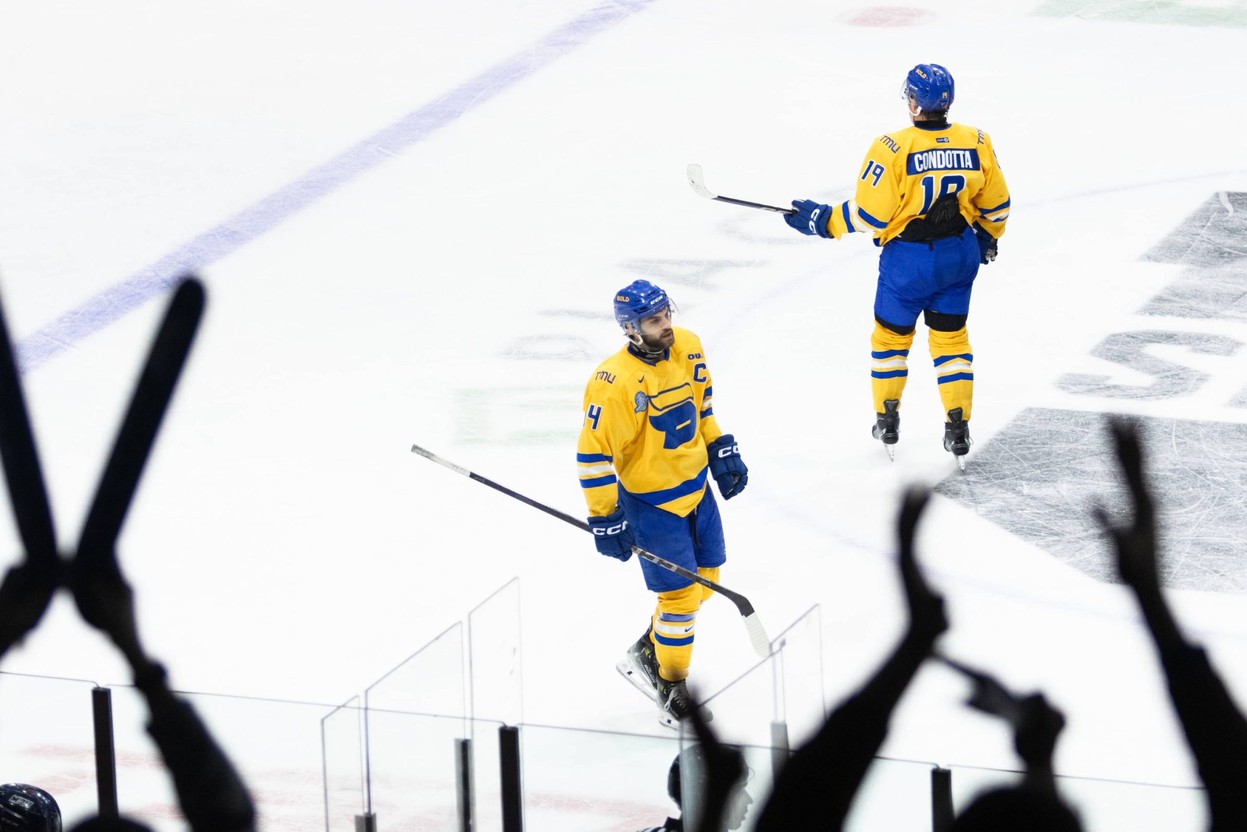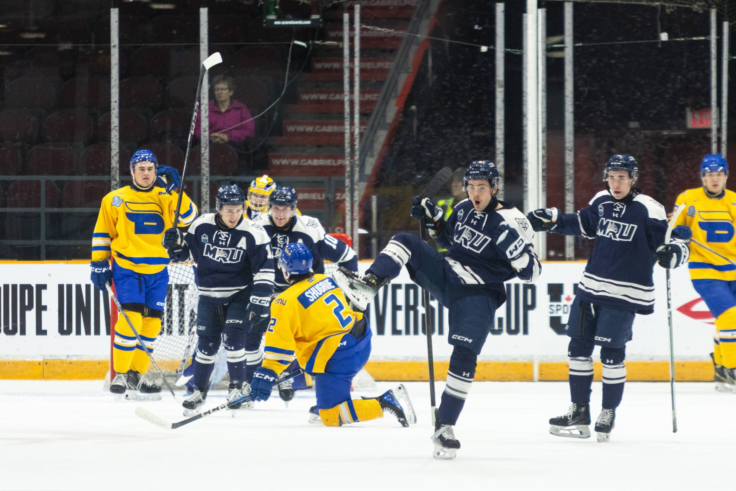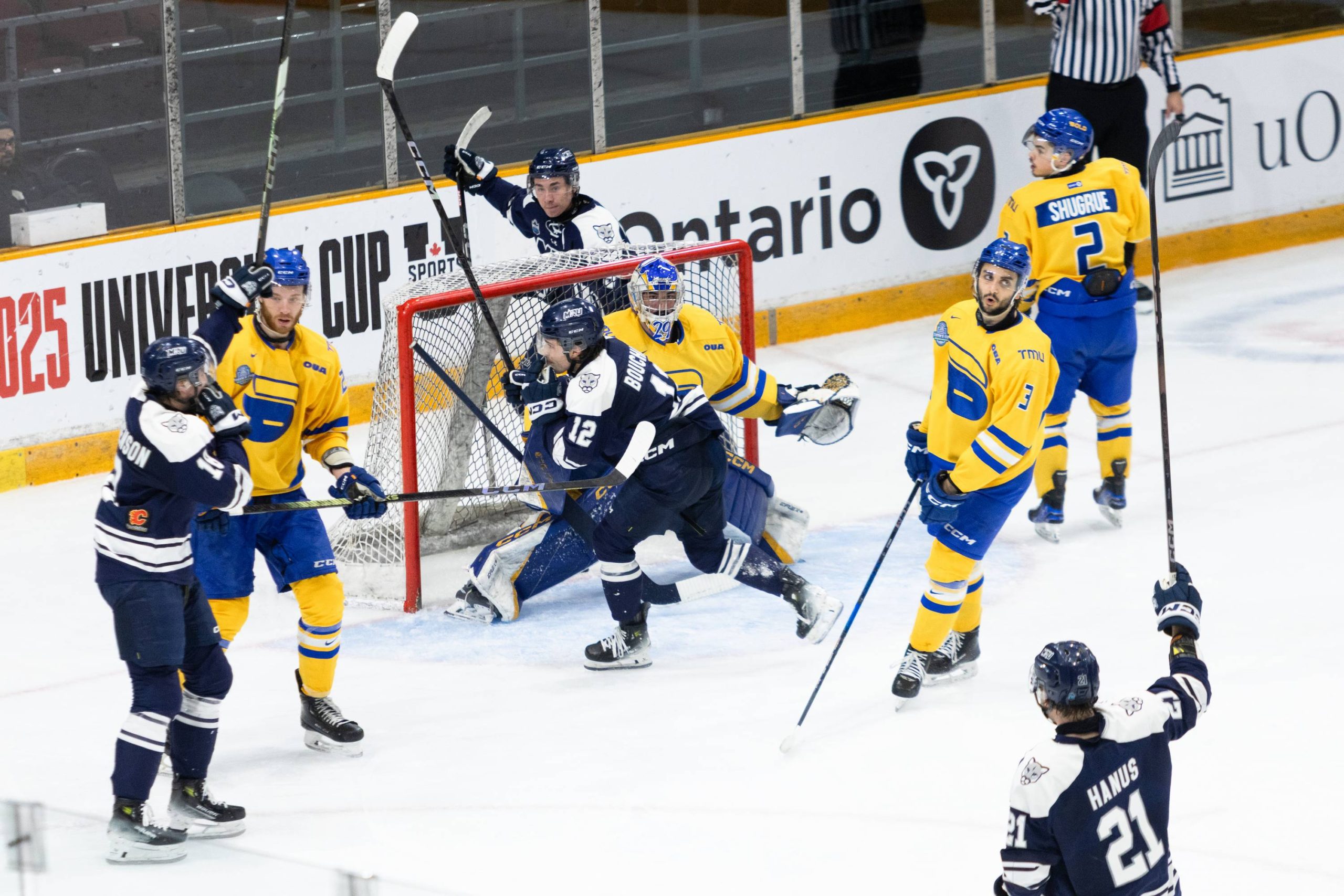 The longest U Sports men’s hockey game ever came to an end after third-year defenceman Evan Brand launched the puck into the offensive zone, creating a scramble in front of the net. Amid the chaos, Shugrue sprawled to the ice, shoved with his stick—which will be sent to the hockey hall of fame following his goal—and pushed the puck over the line to send TMU to the semi-finals of the University Cup (U Cup) for the second straight year.