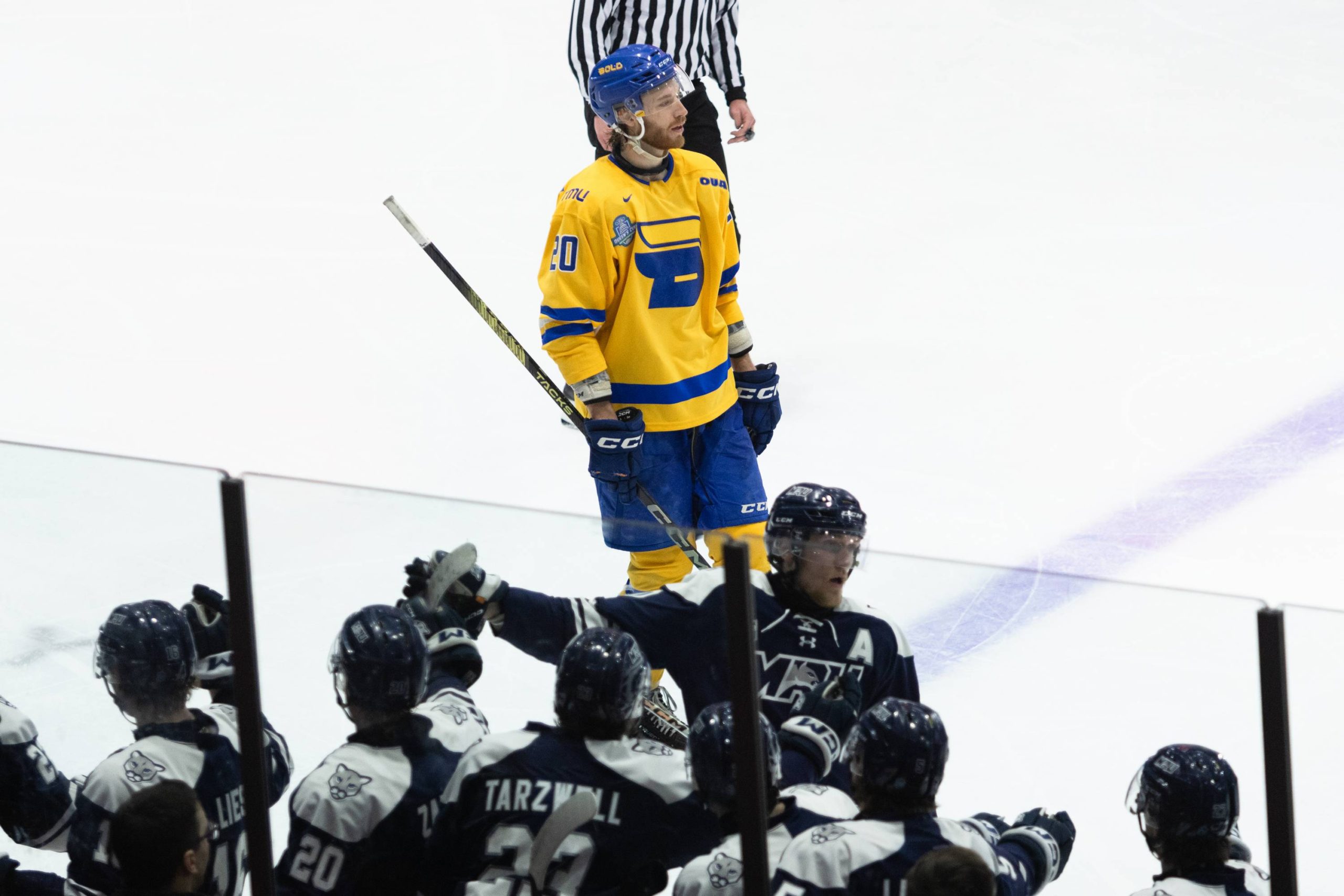The intensity was evident from the opening faceoff, with both teams matching each other’s pace. A turning point came when first-year Bold forward Jordan D’Intino was called for high sticking on a follow through. The penalty meant TMU would have to face a team with the second best power play in the nation at 29.5 per cent—a challenge that quickly proved costly.