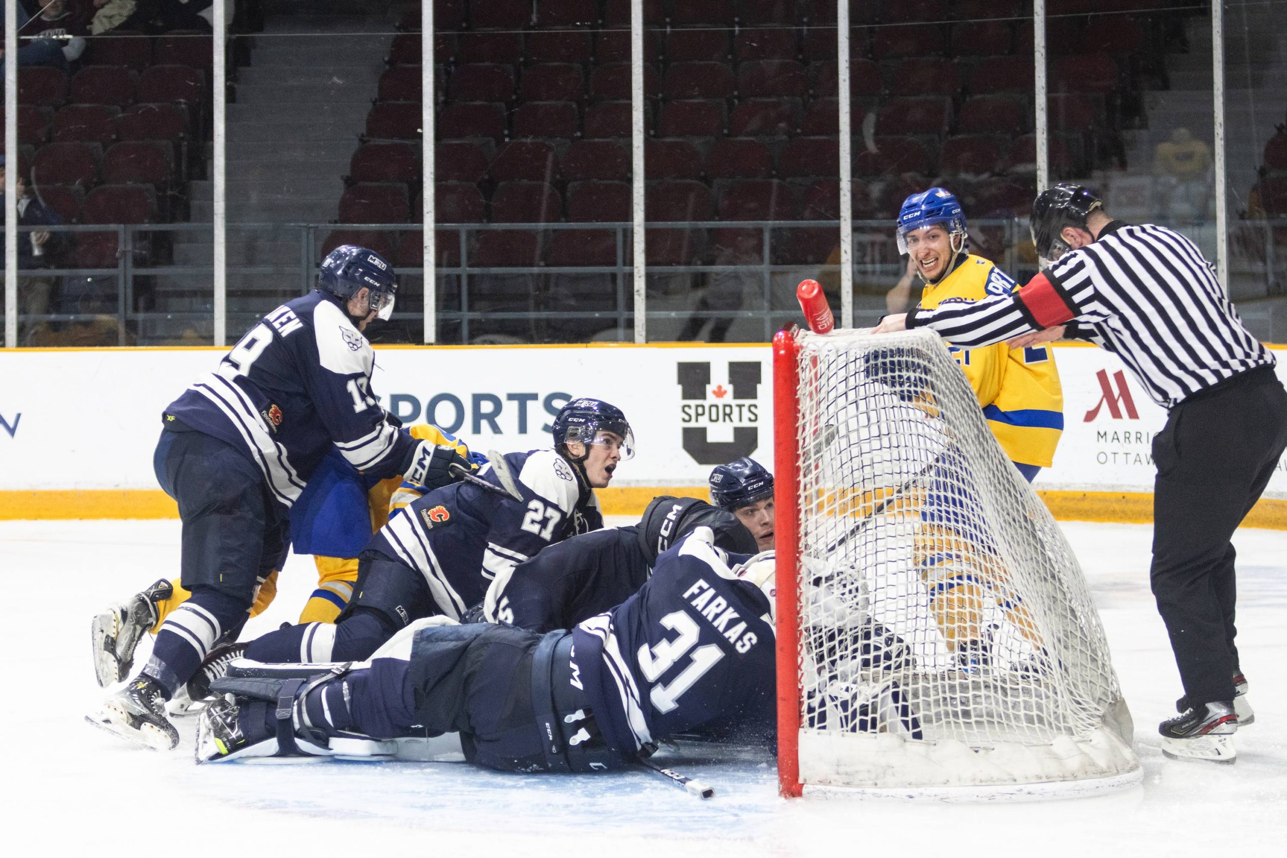 TMU pulled one back in the final minute of the second period. Third-year forward Connor Bowie set up fourth-year forward Kevin Gursoy with a drop pass in the red circle, where Gursoy unleashed a thunderous slapshot past Farkas, cutting the deficit to 3-2.