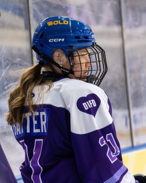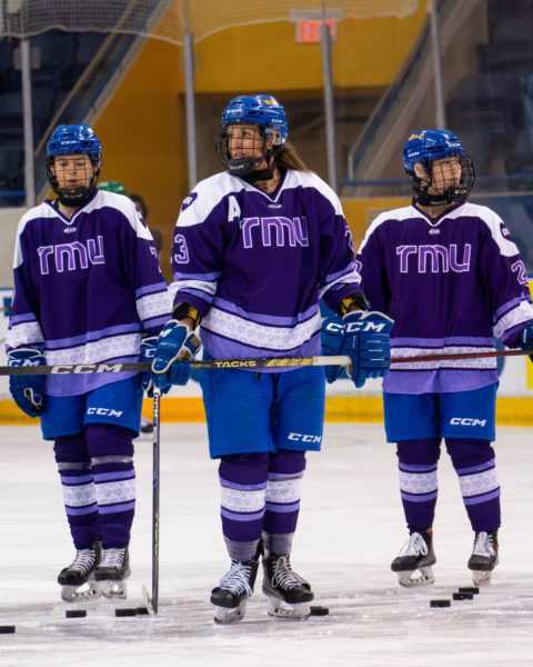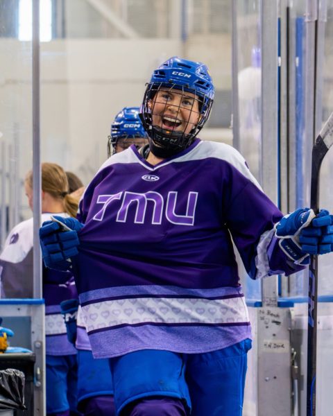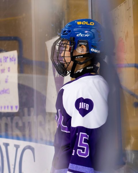 In their purple-themed outfits, the Toronto Metropolitan University (TMU) Bold women’s hockey team arrived early at the Mattamy Athletic Centre (MAC) on Feb. 1 to set up the rink for their Do it For Daron (DIFD) fundraising game. They hung purple and white ribbons on the glass along with a sign that read, “Asking for help is not a sign of weakness.”