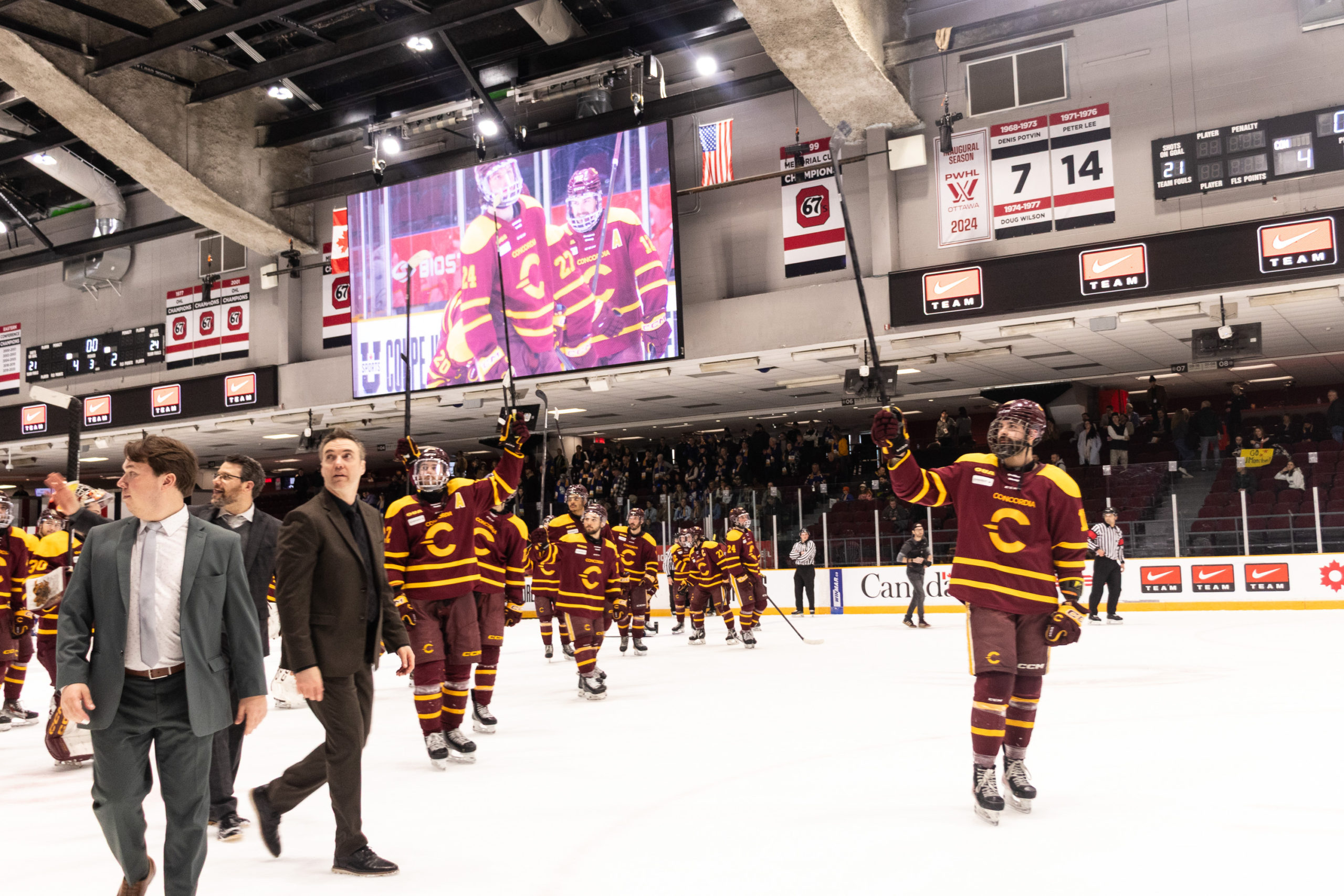 The Gaels pulled their netminder hoping to have late-game luck, however the Huskies’ empty netter solidified their win.