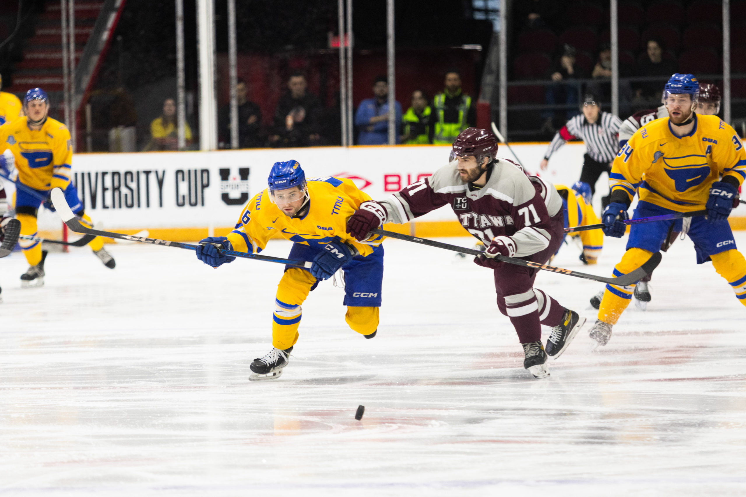 Determined to keep their championship hopes alive, TMU controlled play in the final frame, pinning Ottawa in their defensive zone. Their persistence paid off when first-year forward Tyler Savard buried the equalizer, sending the game down to the wire.