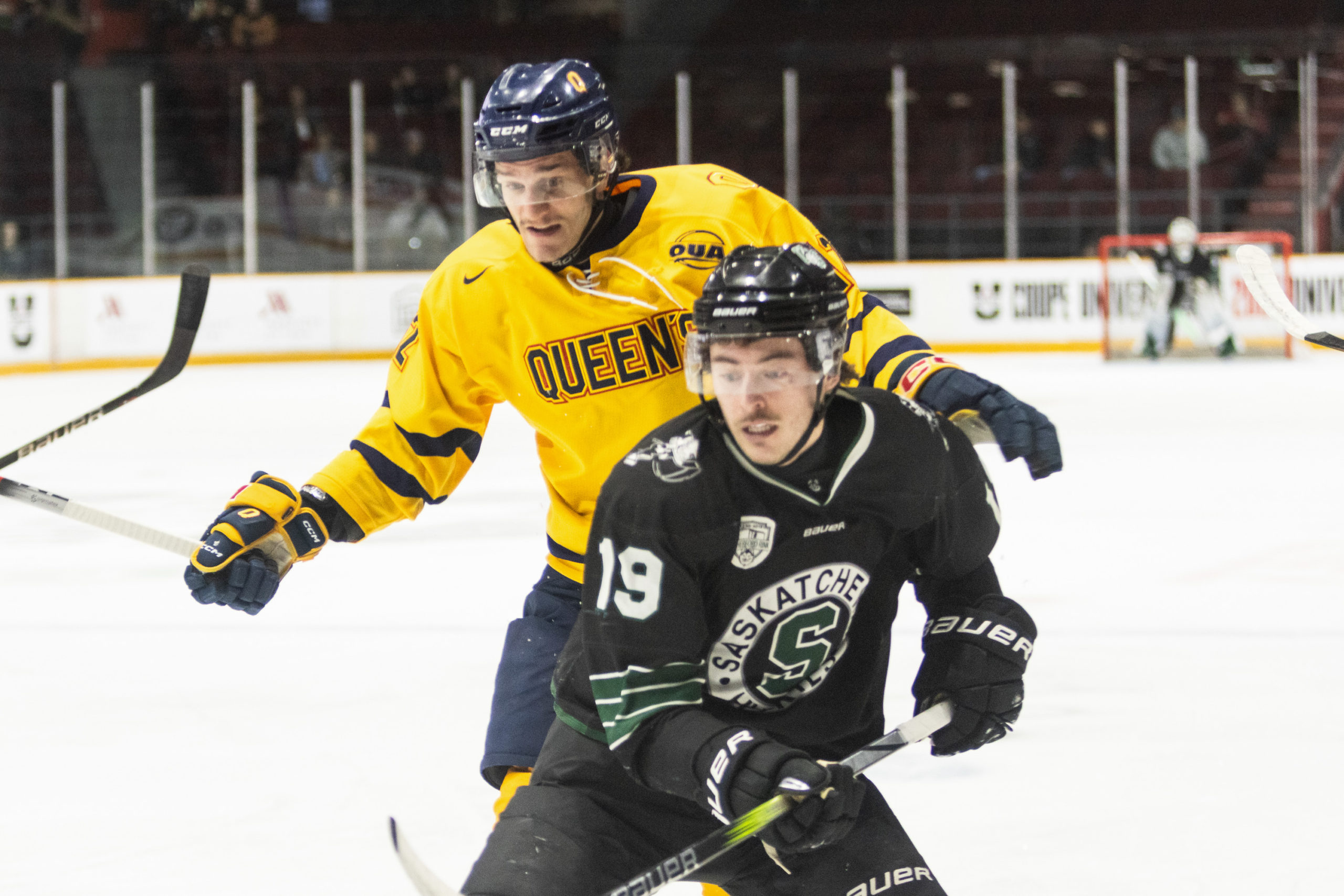 The Gaels started off strong thanks to an early lead—with first-year forward Liam Tanner scoring during the first two minutes of play—followed by a power play goal that gave them a 2-1 lead after the first period. Saskatchewan responded in the second frame with Holt’s second goal and a power play goal from fifth-year forward and captain Justin Ball to switch things around and take a 3-2 lead.
