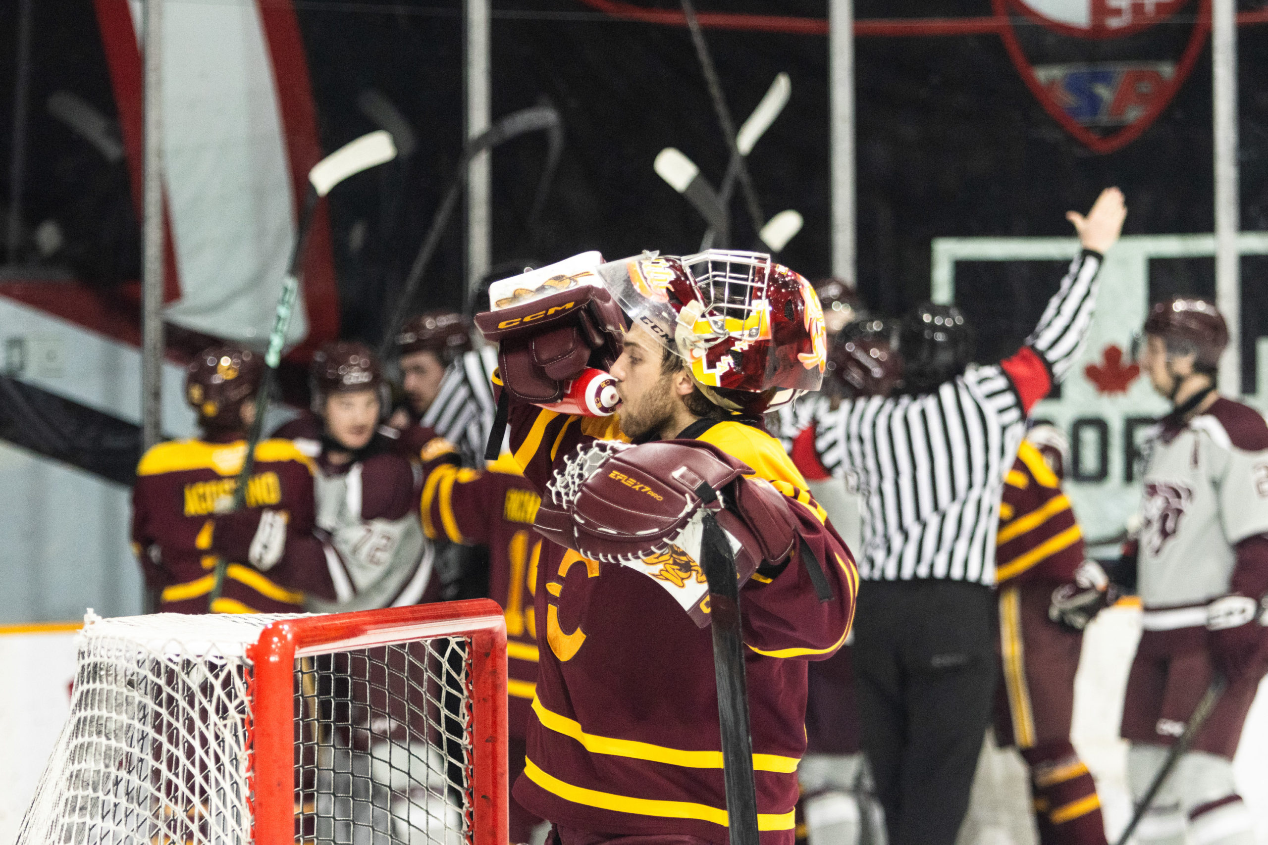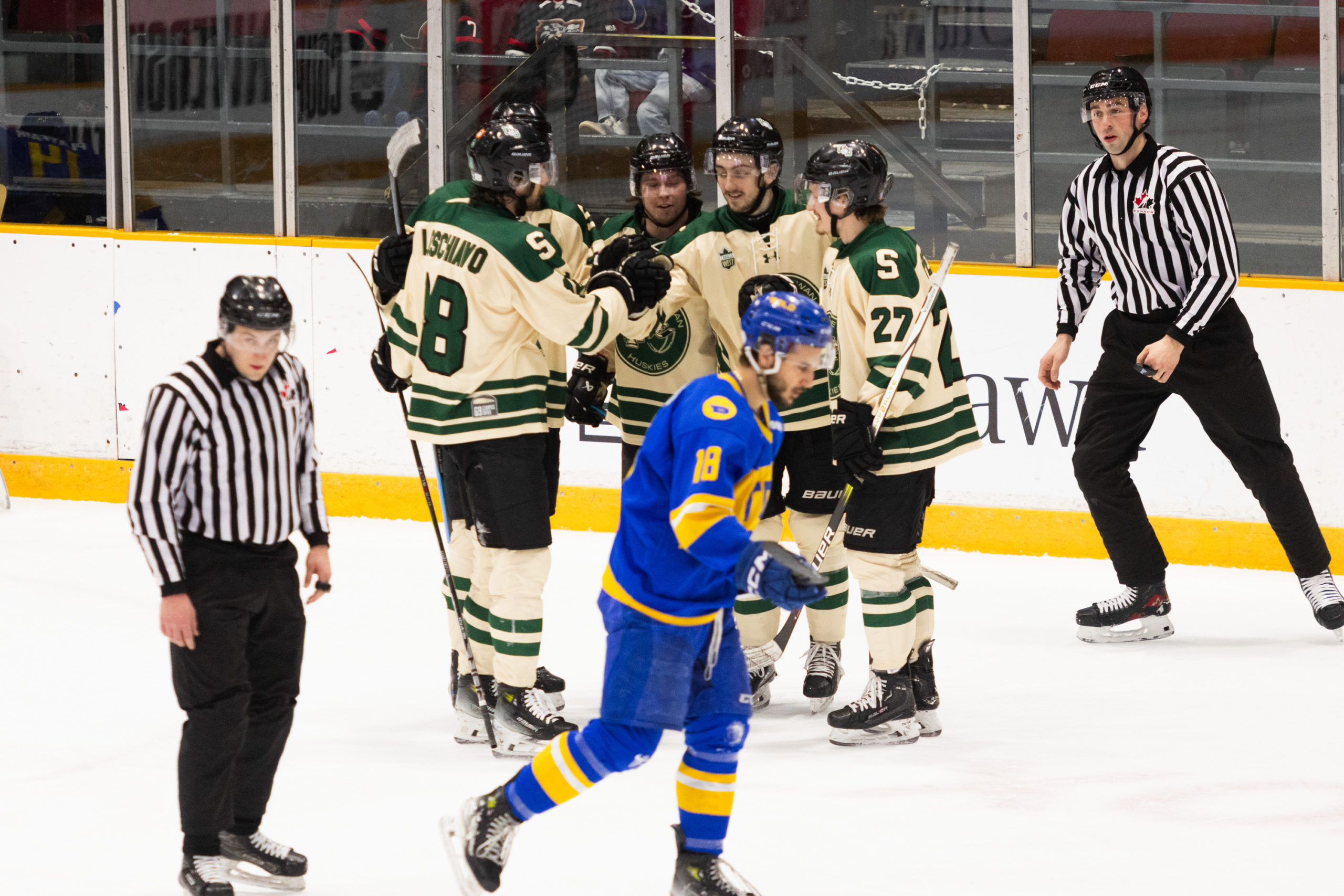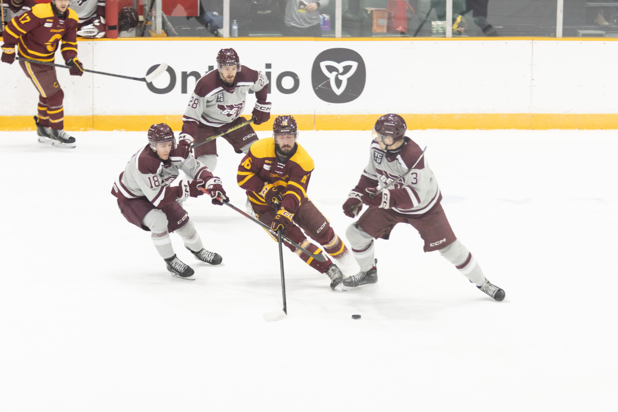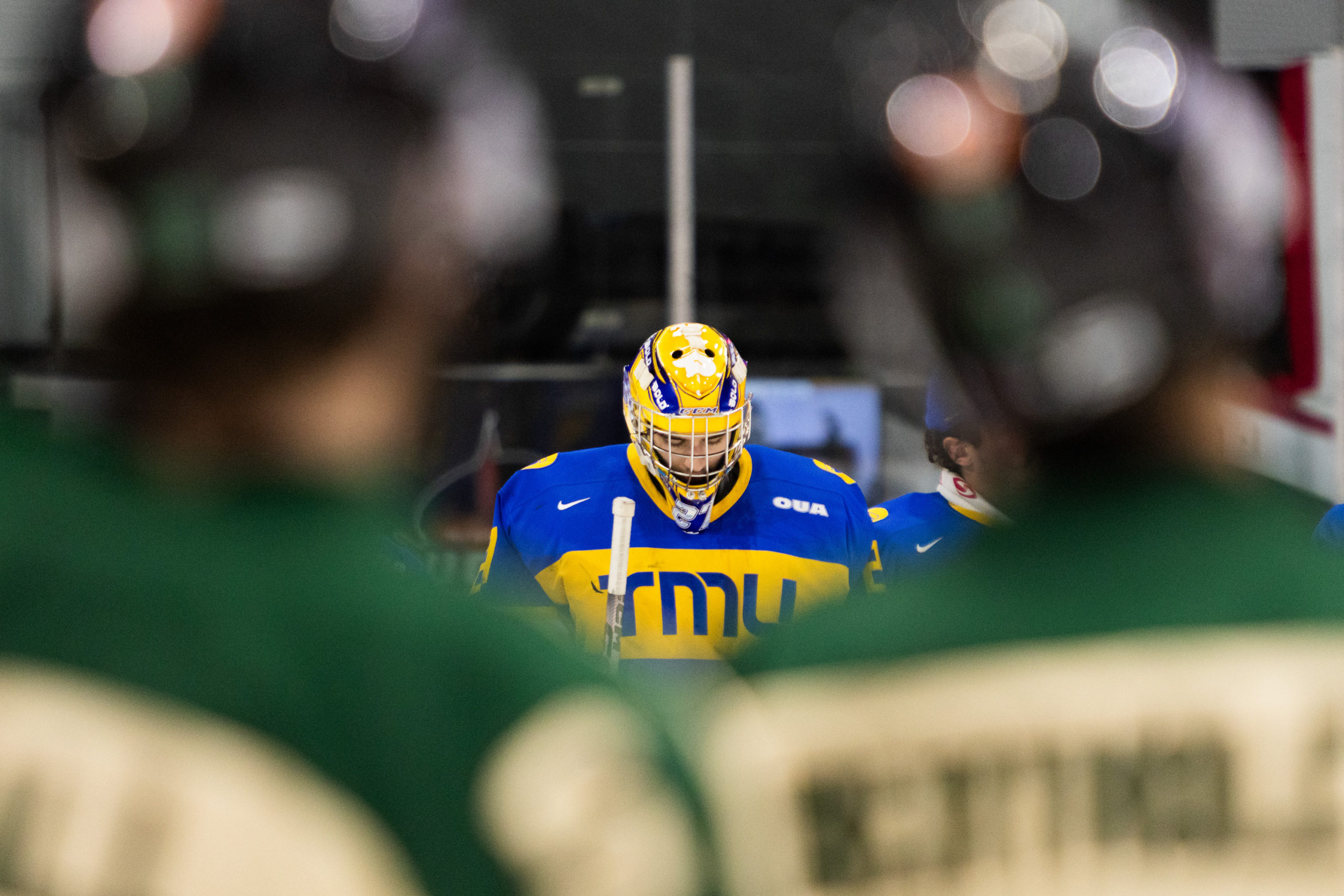 Mount Royal took the lead through third-year defenceman Clay Hanus’ goal on the power play, but third-year defenceman Jaden Condotta responded with an equalizer in similar style. The Cougars built a 3-1 lead, and after a third-period goal, they extended their lead to 4-2. TMU responded by tying the game with goals from third-year forward Ian Martin and second-year forward Daniil Grigorev.