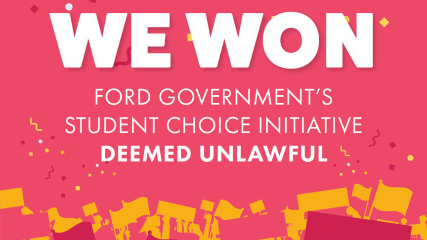 UPDATE: On Nov. 21, it was announced that the Ontario Divisional Court ruled unanimously that the Doug Ford government’s Student Choice Initiative (SCI) was “unlawful,” according to the Canadian Federation of Students (CFS). This came after the CFS and the York Federation of Students in the We The Students Campaign filed a legal challenge against the initiative.
